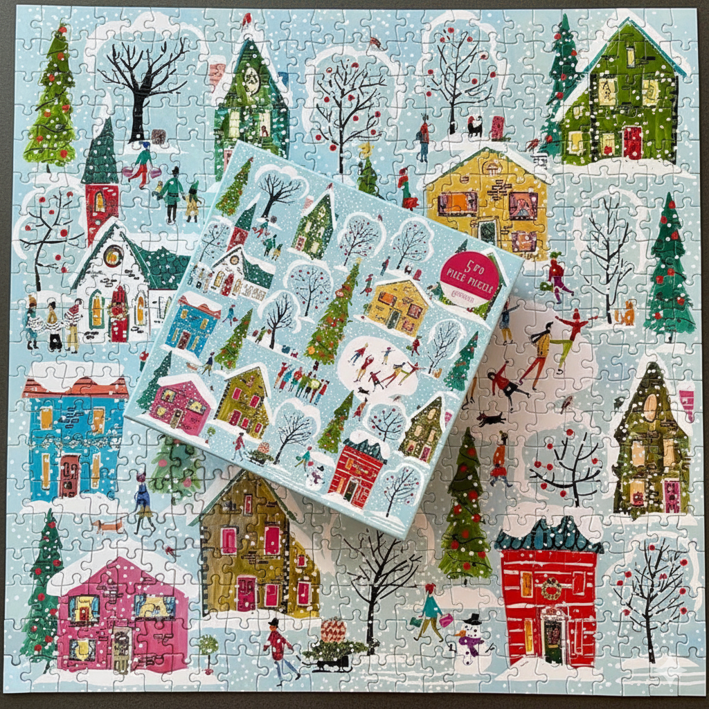 The Twinkle Town 500 Piece Puzzle from features a whimsical illustration of snowy town in the midst of holiday activities.