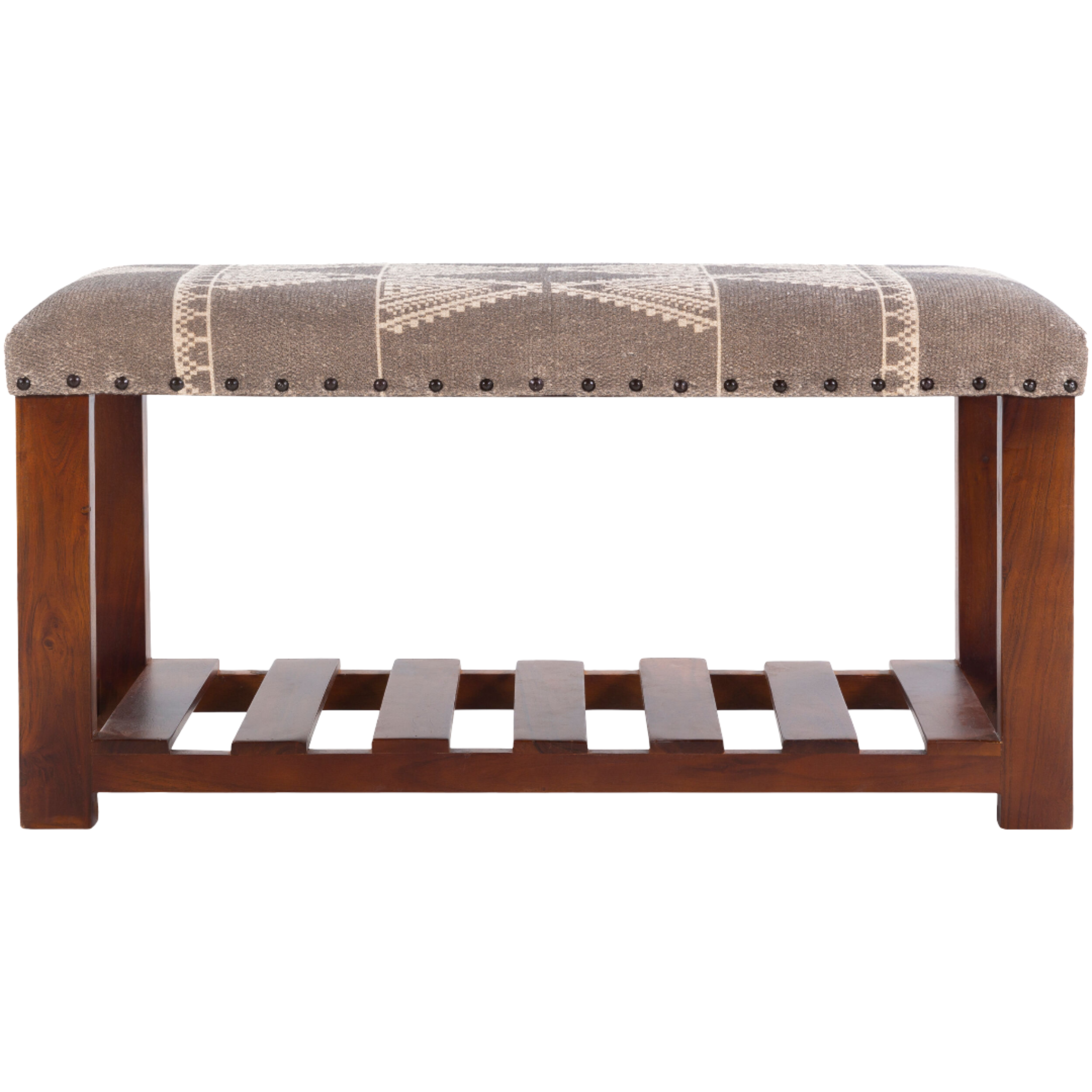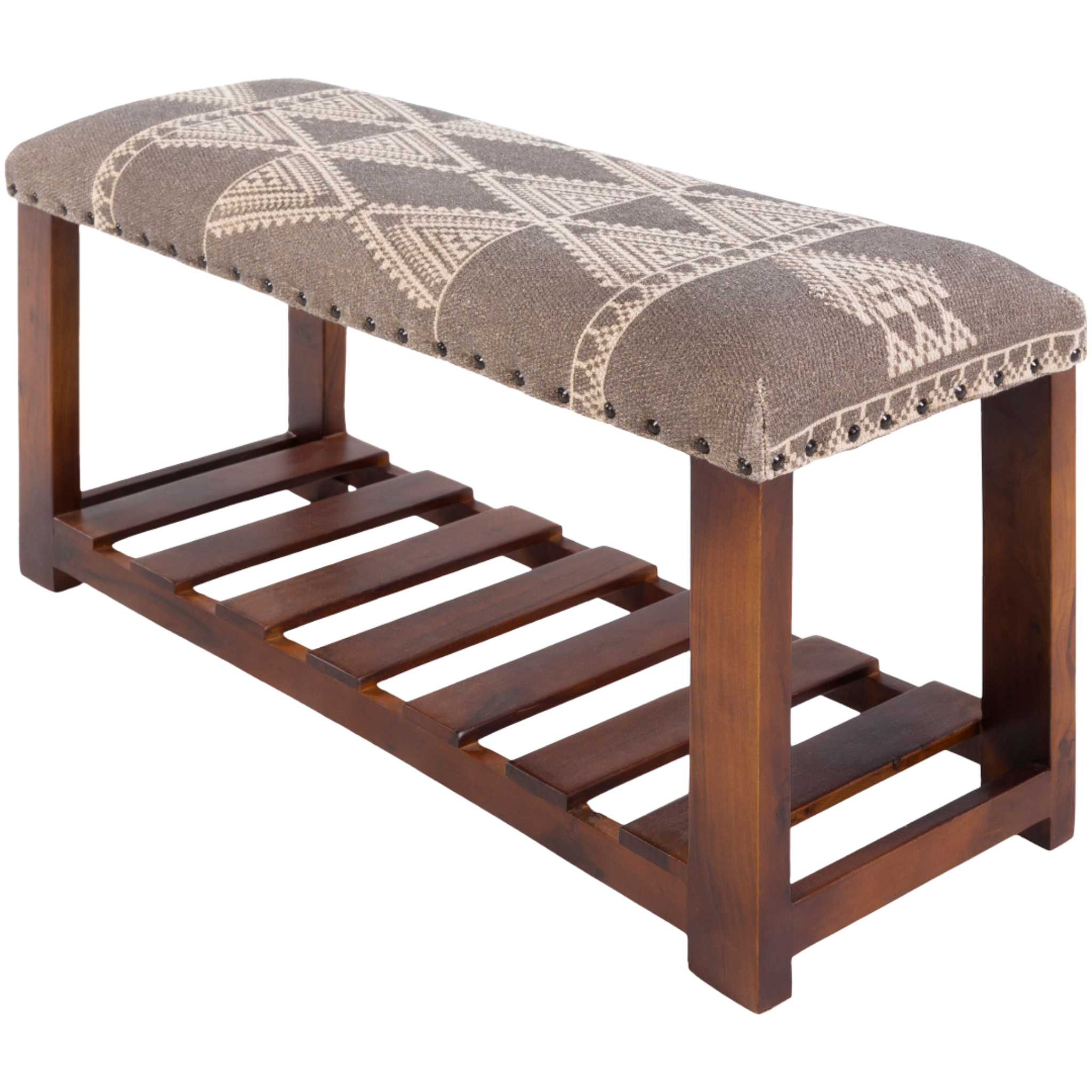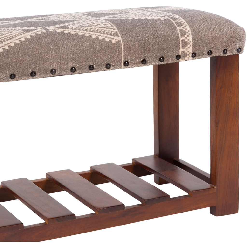 This Slatted Wood & Patterned Upholstered Bench is the definition of style meeting function. A rich, chestnut-finished frame anchors the design, while the cushioned seat—upholstered in a taupe and ivory geometric weave—brings a soft, artisanal touch. The hand-applied nailhead trim adds just the right amount of polish, and the lower slatted shelf is perfect for tucking away shoes, baskets, or a stack of cozy throws.