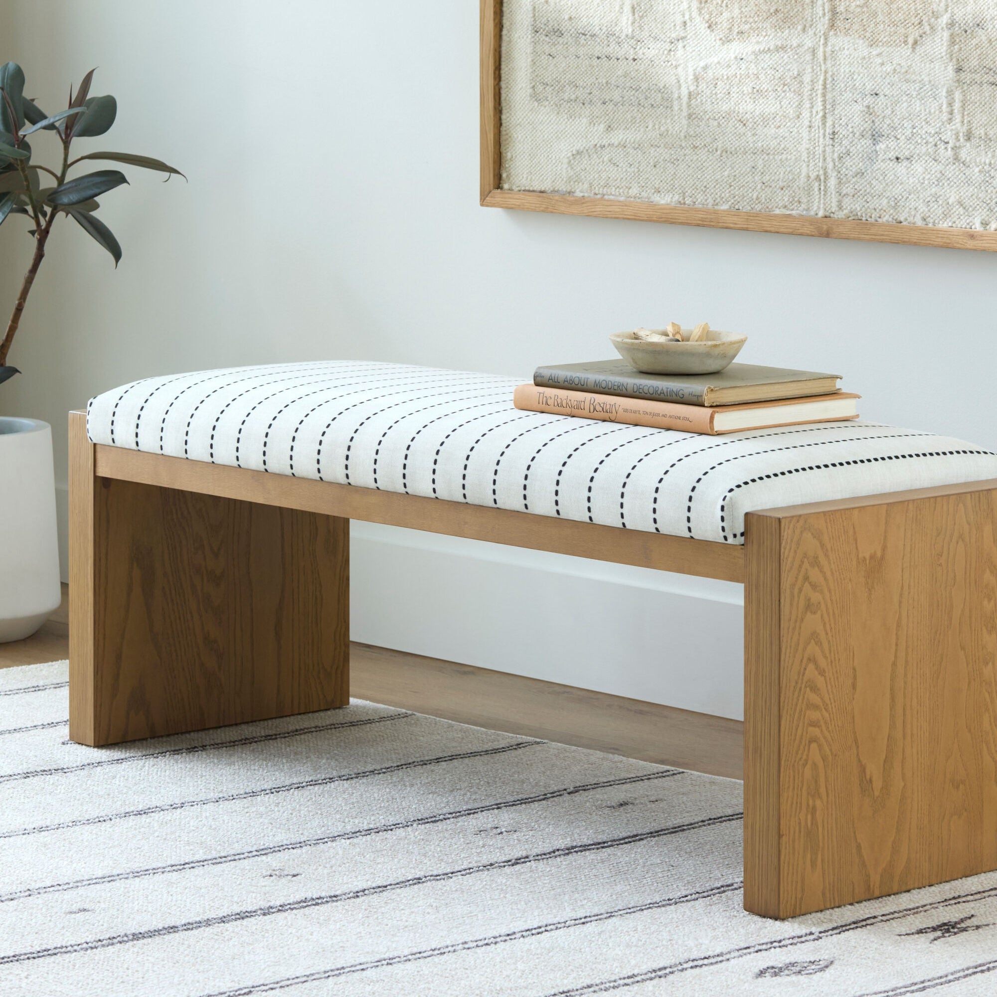 Clean lines meet cozy comfort with this Striped Modern Wood Bench. With its simple, sculptural base in warm, natural wood, this bench brings a grounded presence to any room. The upholstered seat—crisp white with slender black stitched stripes—offers a subtle pattern that plays well with both modern and classic styles. It’s the kind of piece that moves effortlessly from the foot of your bed to the dining table to your entryway, always ready to offer a welcoming perch. Equal parts minimal and inviting, this bench is proof that functional furniture can also make a quiet style statement in your happy house.