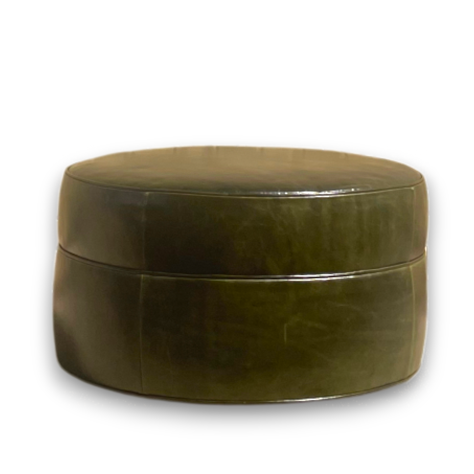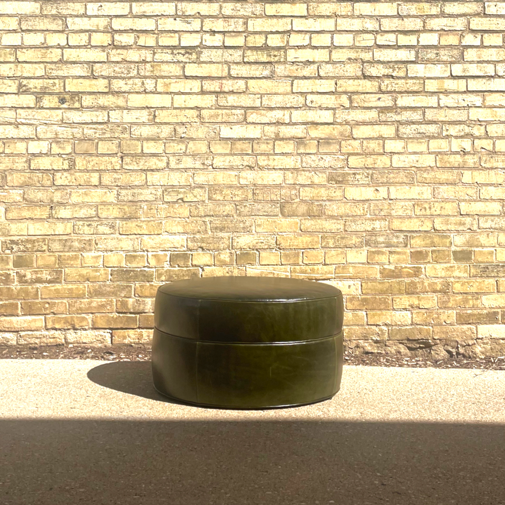 Add a touch of timeless elegance to your living space with this Forest Green Round Leather Ottoman. Upholstered in rich, deep green leather, this piece exudes sophistication and warmth, making it a versatile addition to any room.