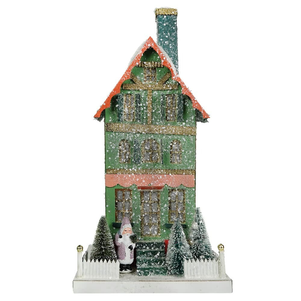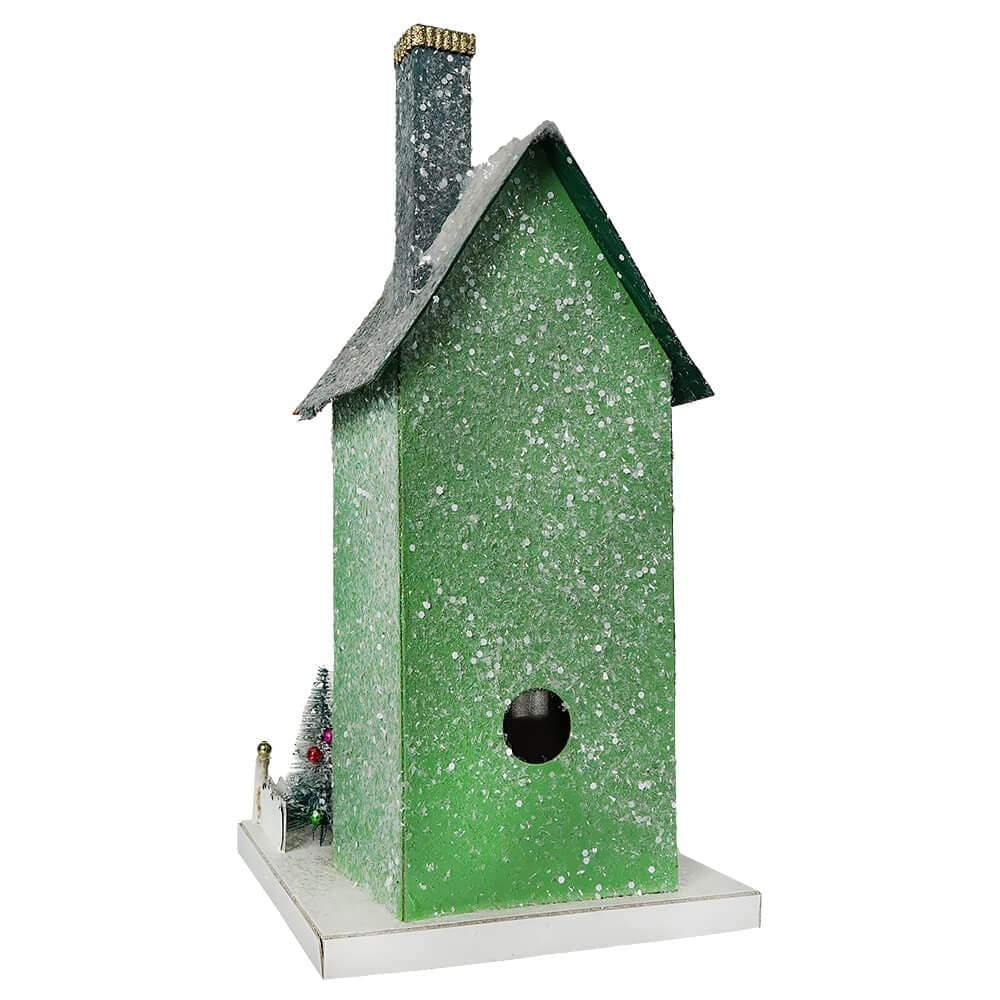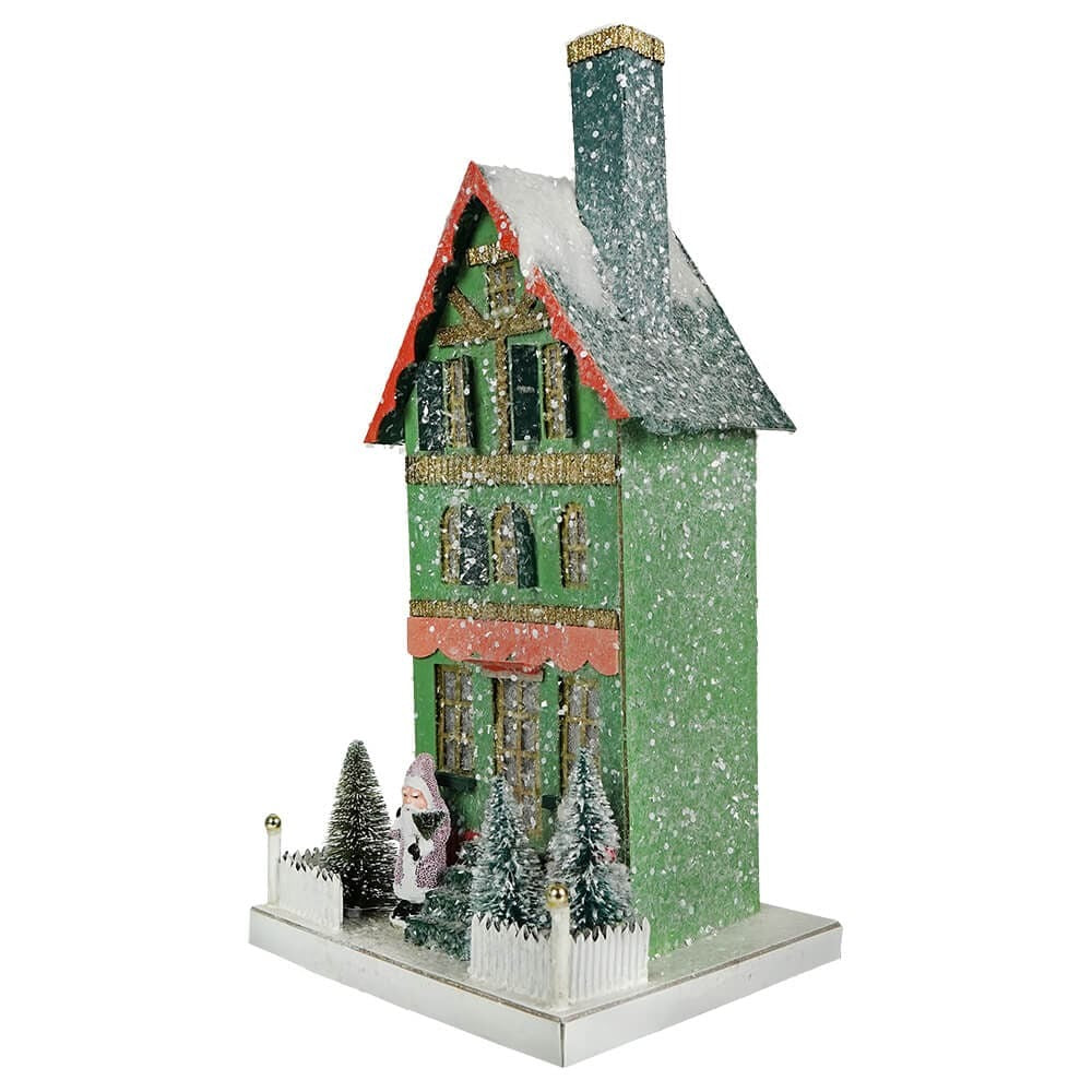 This vintage-inspired Christmas house captures the timeless charm and festive spirit of classic holiday décor. Handcrafted with fine detail, it features a nostalgic design adorned with glitter and mica for a soft, wintry sparkle. A perfect addition to any Christmas village or mantel display, it reflects the artistry and whimsy that make handcrafted holiday pieces so special.