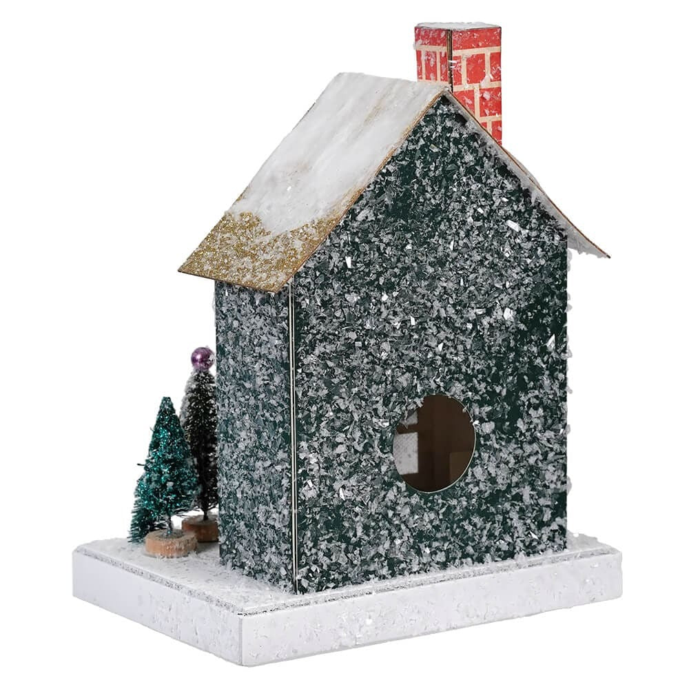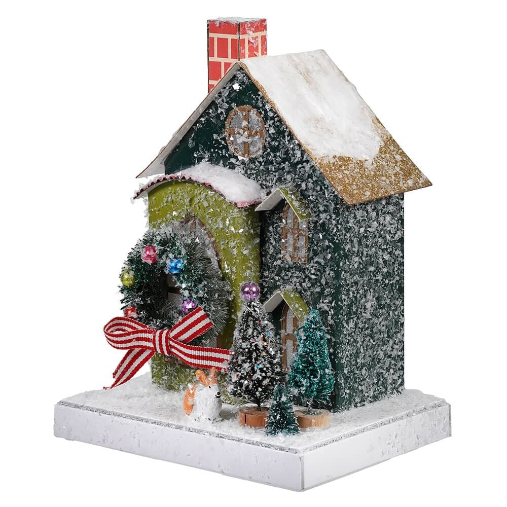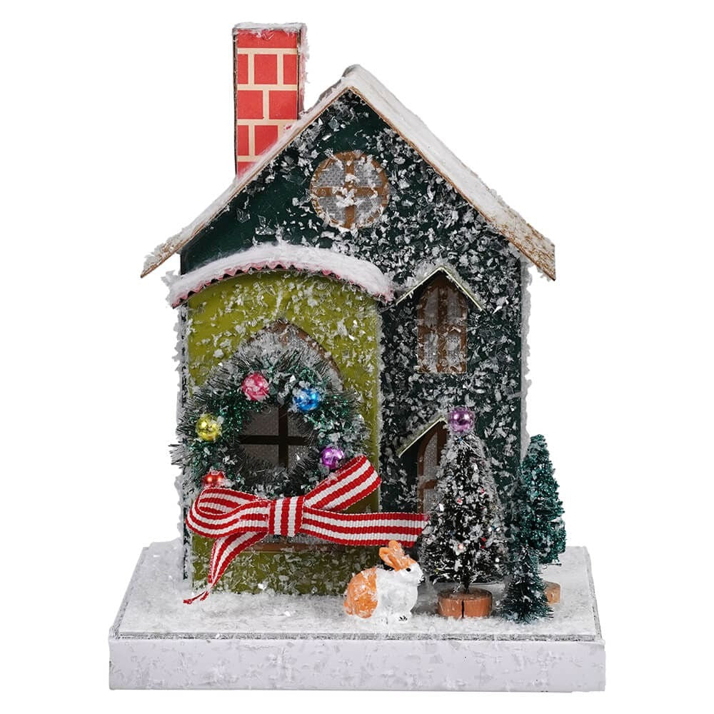 The Petite Green House With Bunny brings a touch of festive whimsy and woodland charm to your holiday décor. Featuring two shades of green, a red brick chimney, and a snow-dusted roof, this delightful miniature house captures cozy seasonal magic. A vibrant wreath adorned with colorful ornaments decorates the front window, while an adorable bunny rests at the doorstep, adding a heartwarming touch to this enchanting scene.