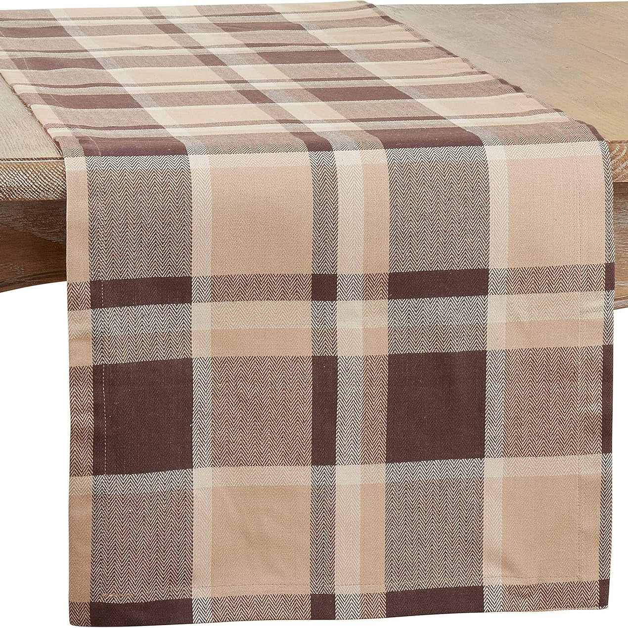 A warm brown plaid runner designed to bring a cozy, inviting look to your dining table. Complements seasonal or neutral themes beautifully.