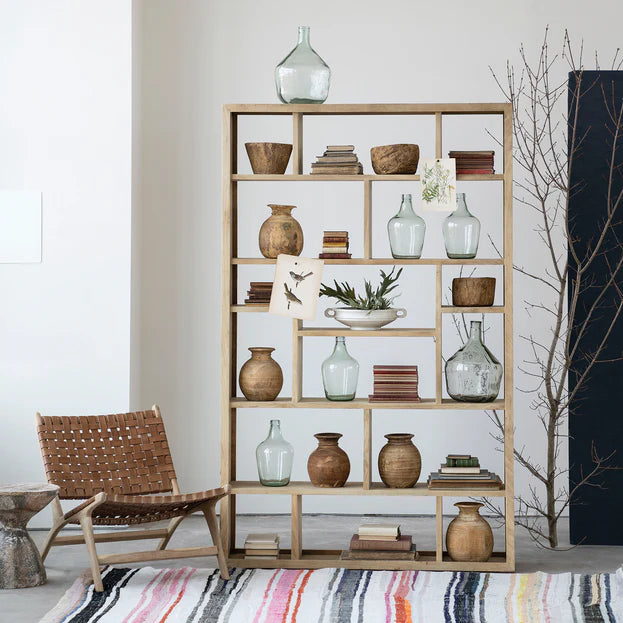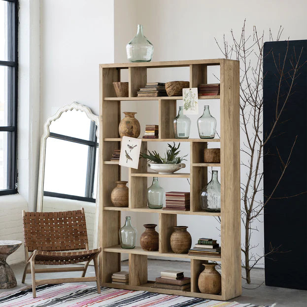 This shelving unit is a true workhorse with a beautiful point of view. Crafted from warm, natural wood, its clean-lined frame and thoughtfully varied cubbies create a balanced, architectural look that feels both structured and relaxed. It’s designed to hold a mix of everyday essentials and meaningful objects—books, baskets, artwork, and collected treasures.