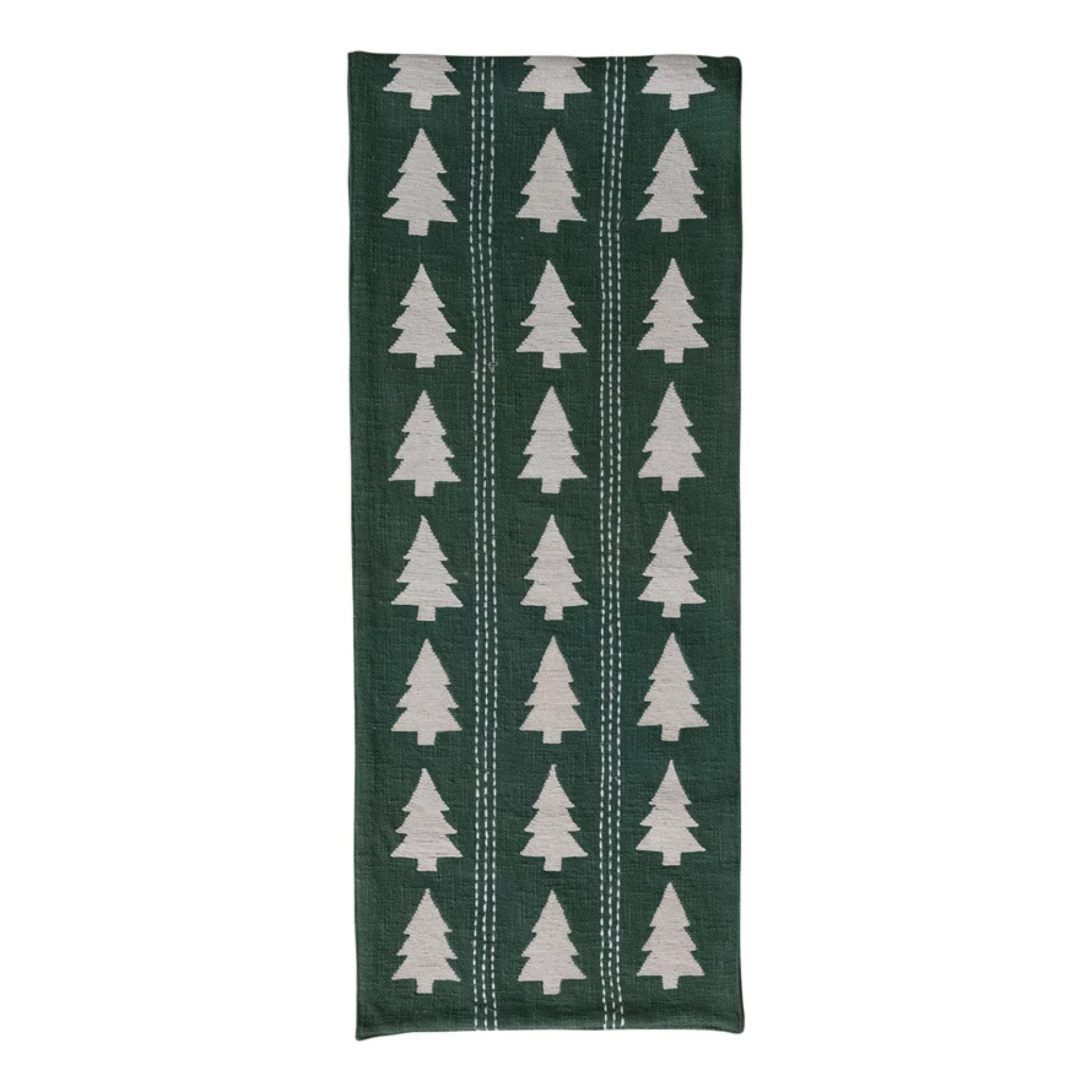 A beautifully embroidered table runner featuring a delicate tree pattern in green and natural tones. The stitched detailing adds texture and charm, perfect for bringing a cozy, nature-inspired touch to your dining table during any season.