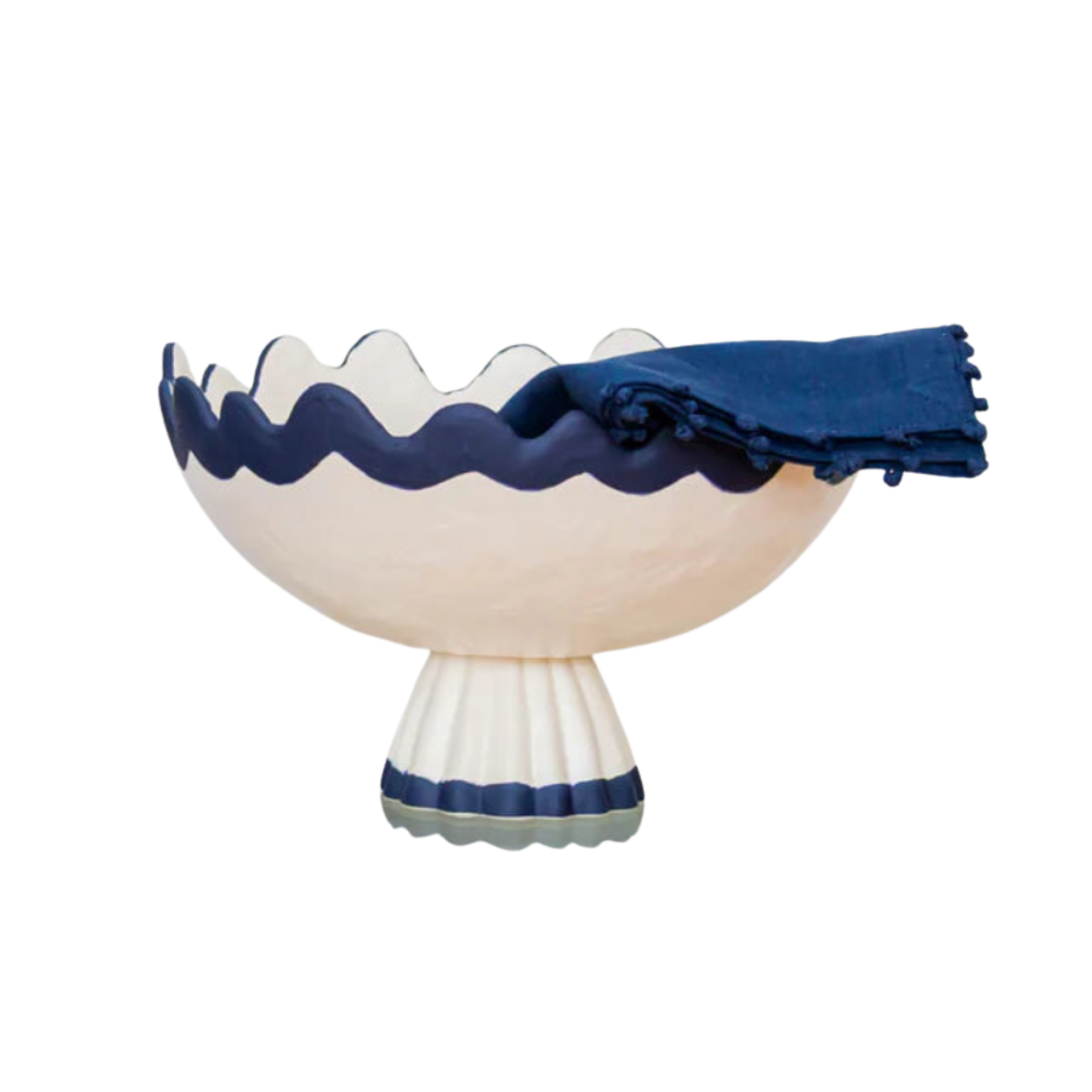 This footed bowl is the kind of piece that instantly makes a space feel more collected and cared for. The soft, creamy glaze is grounded by a deep navy scalloped edge—just enough contrast to feel special without shouting for attention. This statement piece bring charm and personality to any shelf or tablescape.