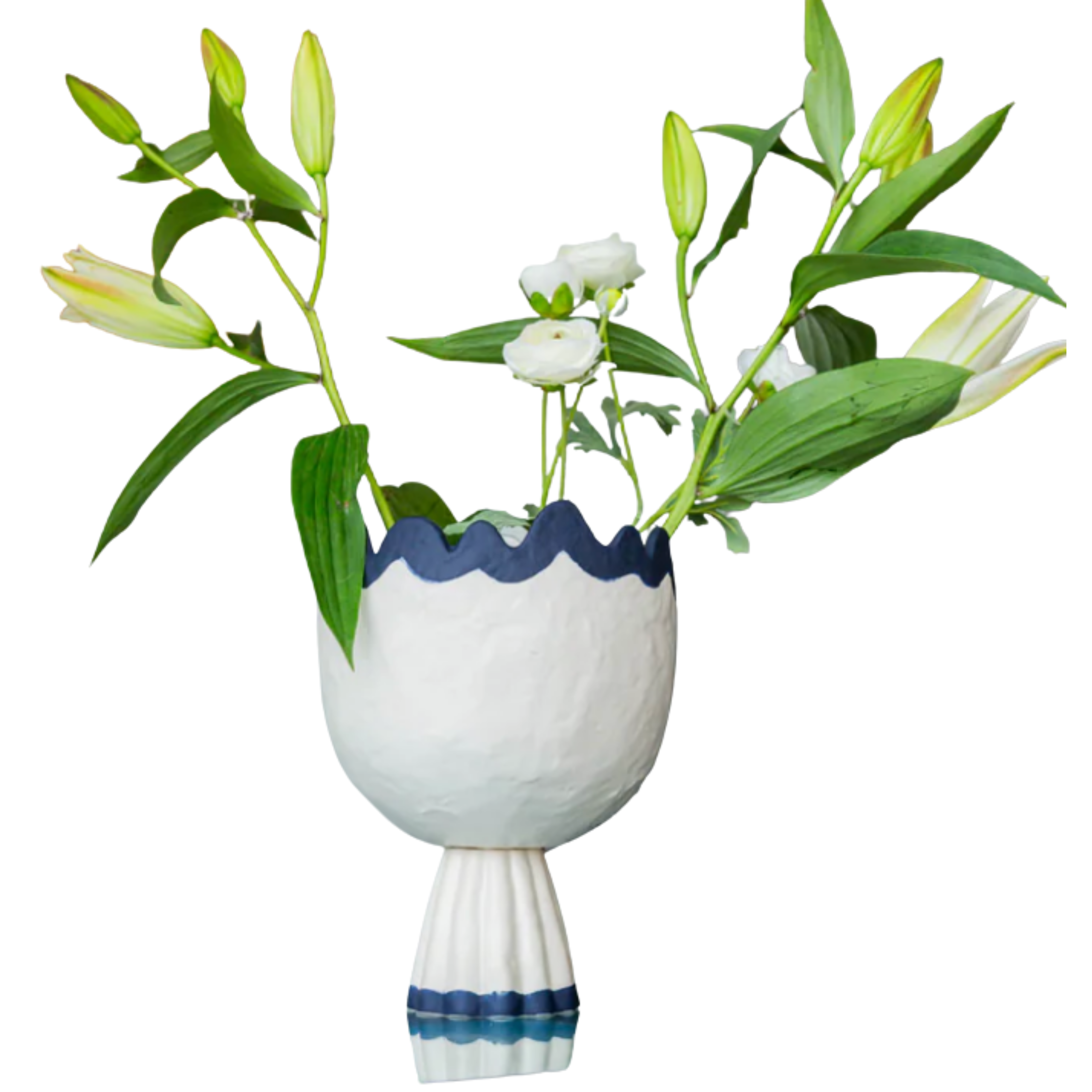 This cachepot is an instant classic—the kind of piece that makes even the simplest houseplant feel intentional. The softly textured white finish is topped with a deep navy scalloped rim, adding just the right amount of contrast and charm. Its footed base gives it a slightly elevated presence, turning greenery into a true design moment. This statement piece bring charm and personality to any shelf or tablescape.