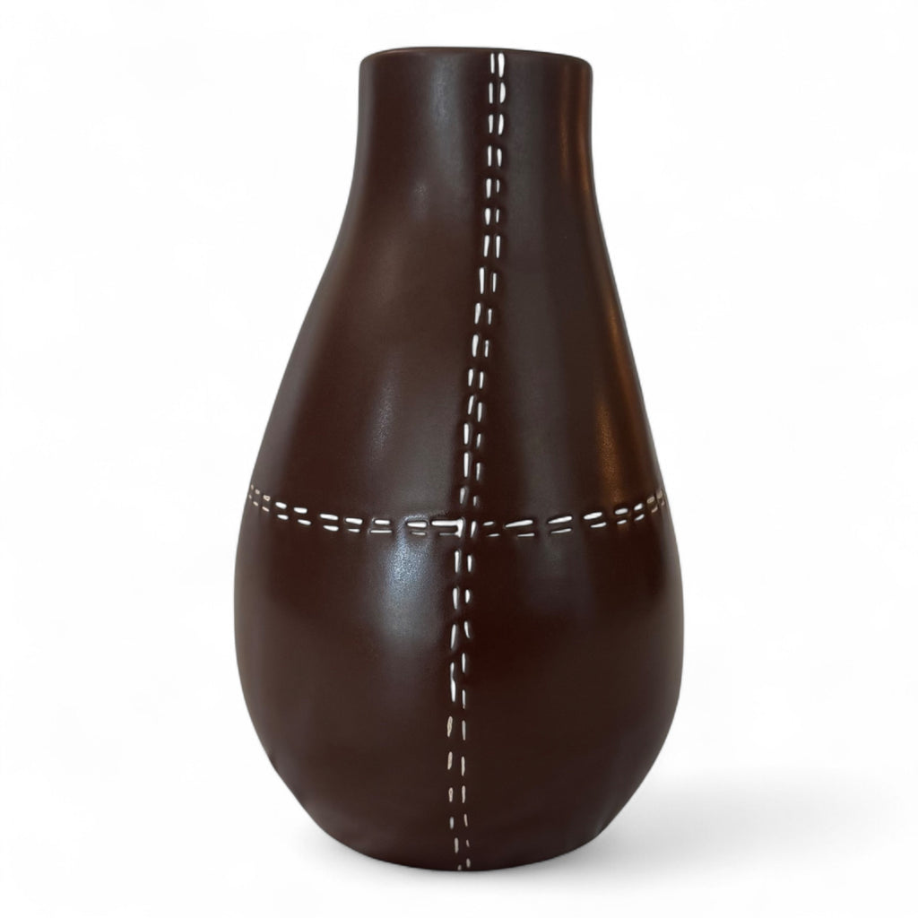 Vintage Ceramic Vase – Dark Brown with Stitching Detail