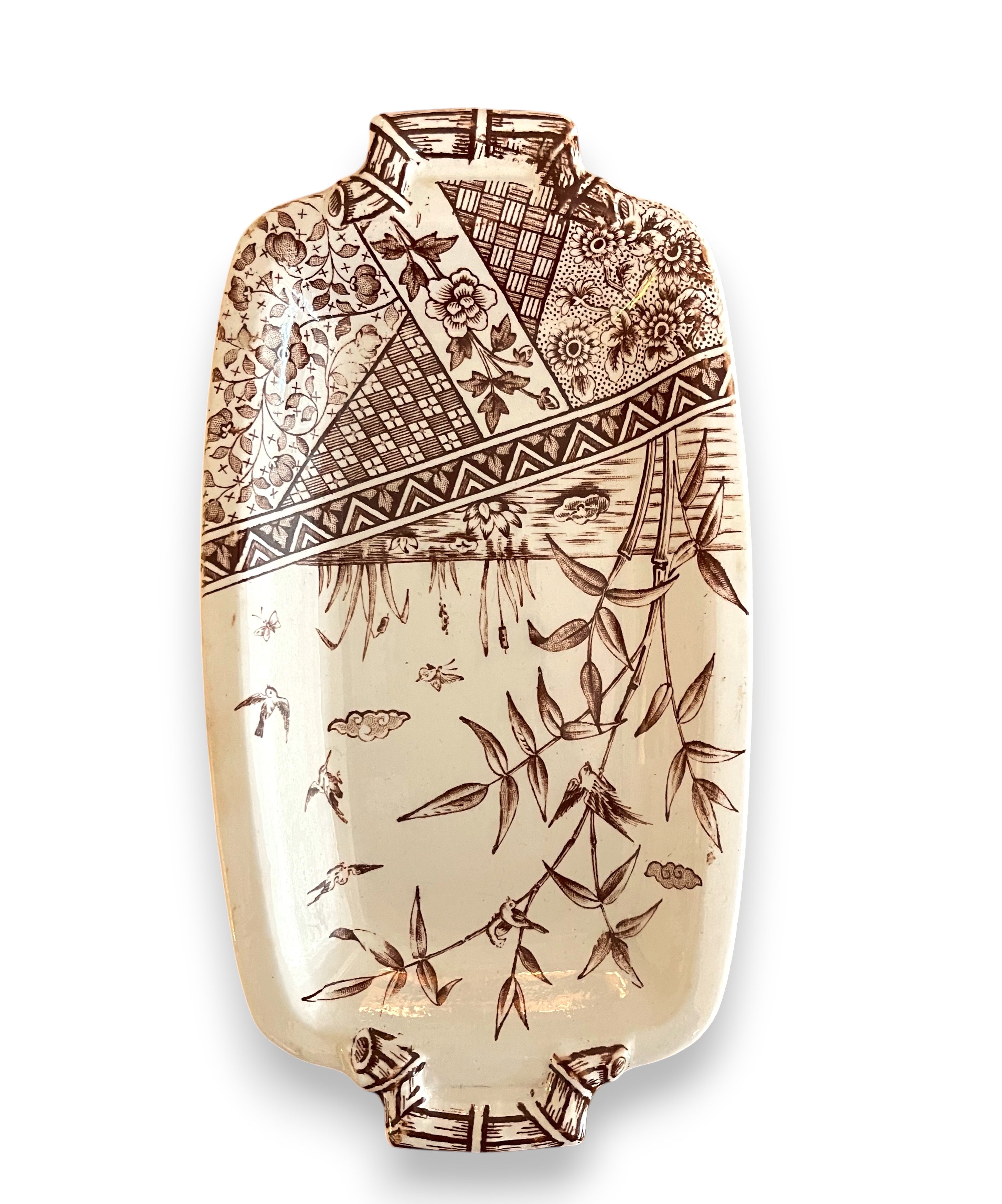 The platter’s unique rectangular shape, paired with its intricate border and delicate bamboo-inspired motifs, makes it both a collector’s piece and a versatile serving dish. Its subtle crazing and gentle wear are the marks of history—adding character without compromising beauty.