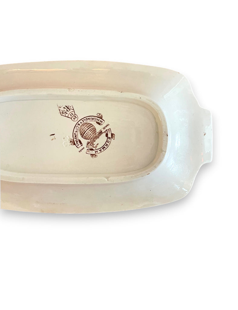 This antique ironstone platter is a true treasure, showcasing a stunning brown transferware design with a mix of floral, geometric, and botanical details. Crafted in England by Doulton Burslem, this piece dates back to the late 1800s and carries all the charm of timeless English pottery.