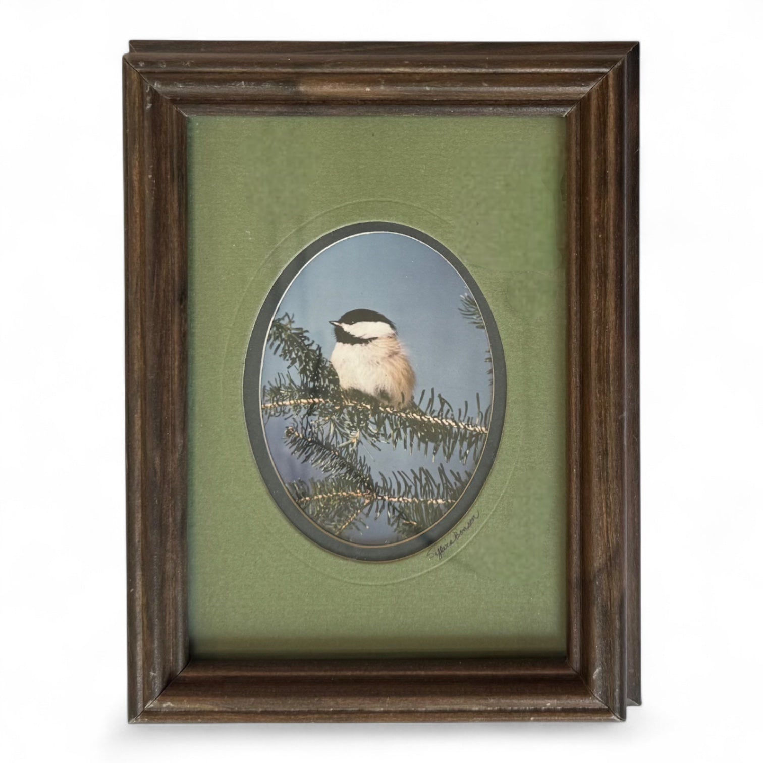 This vintage photograph captures the quiet beauty of a chickadee perched on a pine branch, framed with care and framed to preserve its timeless charm. The hand-done detail and soft tones bring a sense of coziness and nature indoors—perfect for layering into a gallery wall, styling on a shelf, or gifting to a bird lover.